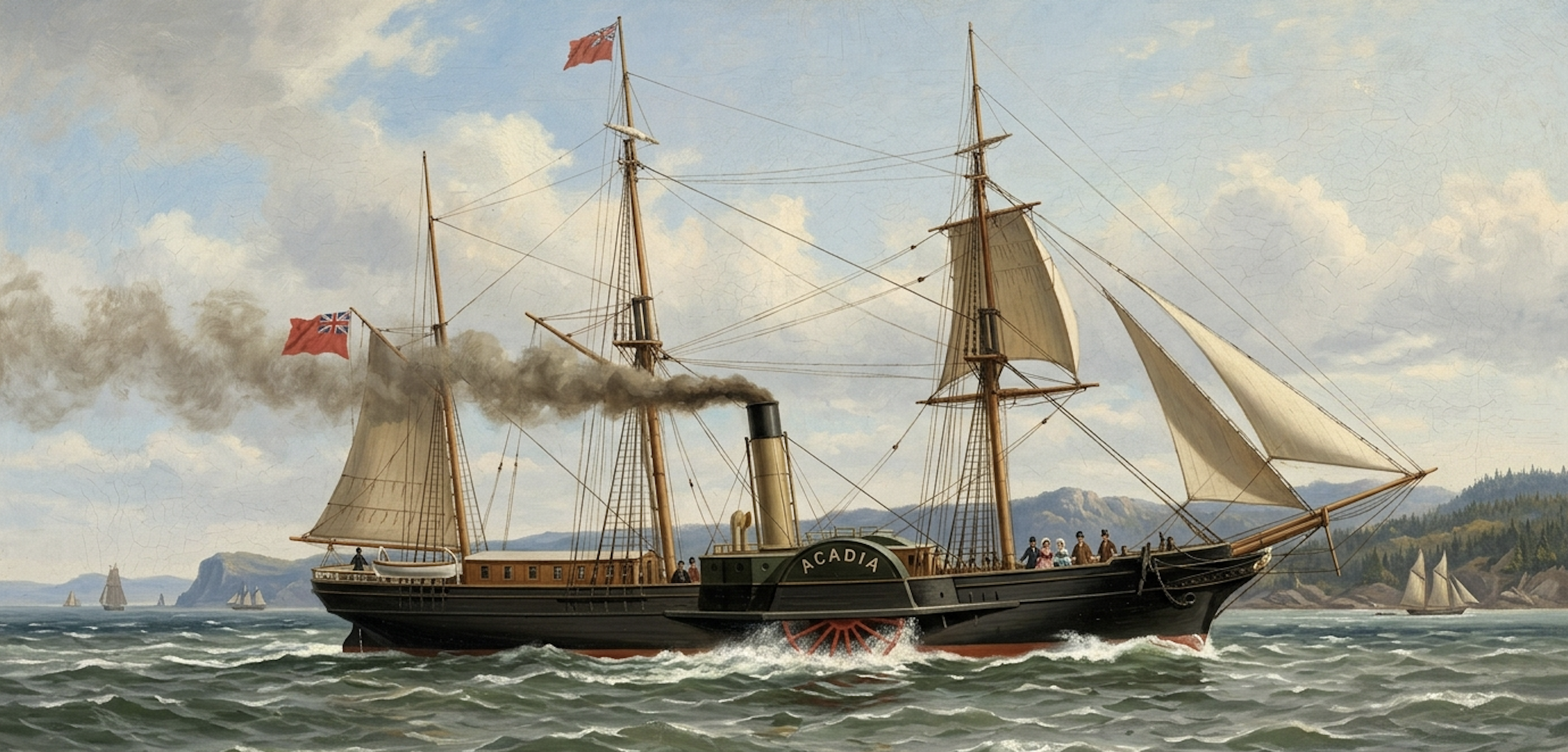 As a sister of Britannia, the Acadia played a key role in establishing the Cunard’s transatlantic steamship service. Built by Robert Duncan and Company at Port Glasgow, she was the second of the four pioneering steamers.