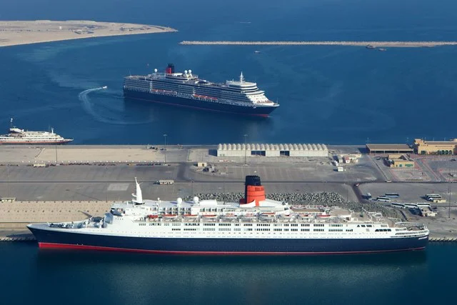 Image note: QE2 and Queen Elizabeth in Dubai, courtesy Cunard.